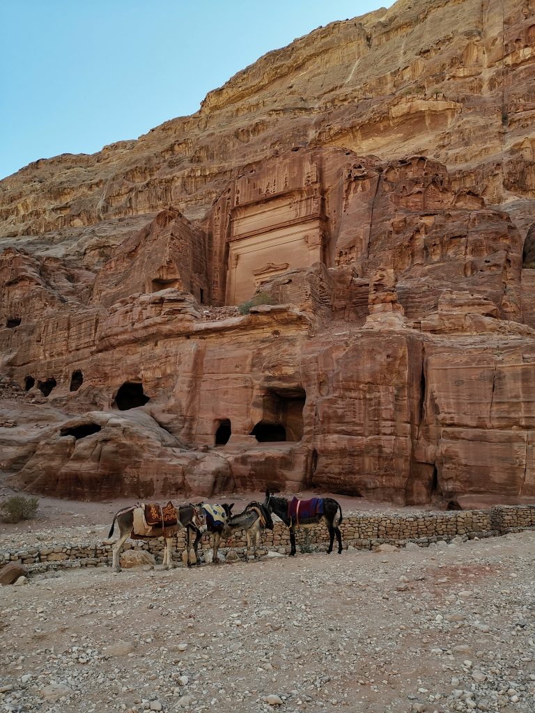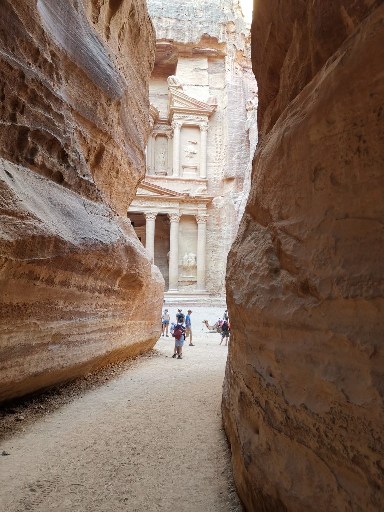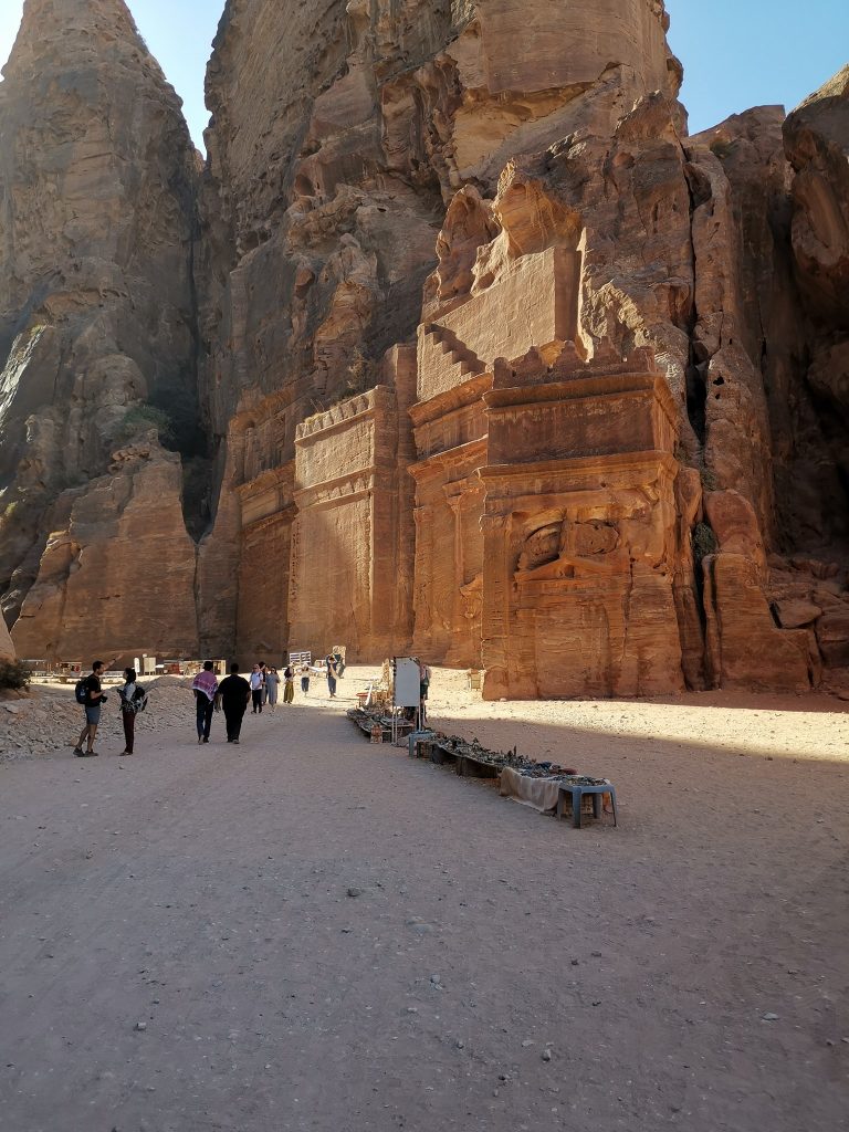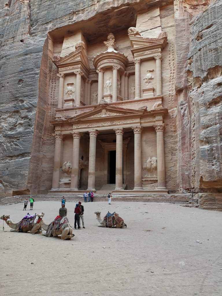 Najsłynniejszą budowlą w Petrze, której z niecierpliwością wypatrywaliśmy jest Skarbiec (Al-Chazna). Widać go już wychodząc z siqu, kiedy częściowo zasłaniają go wysokie skały. Skarbiec został wybudowany w hellenistycznym stylu jako królewski grobowiec, jednak nazwę swoją zawdzięcza legendzie o skarbie egipskiego faraona ukrytym w urnie w fasadzie, w co głęboko wierzyli Beduini, stąd budowla była plądrowana wielokrotnie i dziś nie jest już dostępna dla zwiedzających. Miny i zachwyt jaki mieliśmy na twarzach porównywalny jest do momentu kiedy Indiana Jones przybywa tu w finałowej scenie „Ostatniej Krucjaty”. Końcowy rozdział w dziejach Petry pisali Beduini z plemienia Huwaitat. Przez dziesiątki lat po starożytnych schodach wędrowały tu owce i kozy, w jaskiniach rodzili się i umierali beduińscy nomadowie aż do 1985 roku kiedy to Petra z całą swą niezwykłością i ruinami skalnego miasta wpisana została na listę Światowego Dziedzictwa Kultury UNESCO i udostępniona turystom.