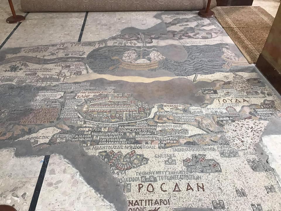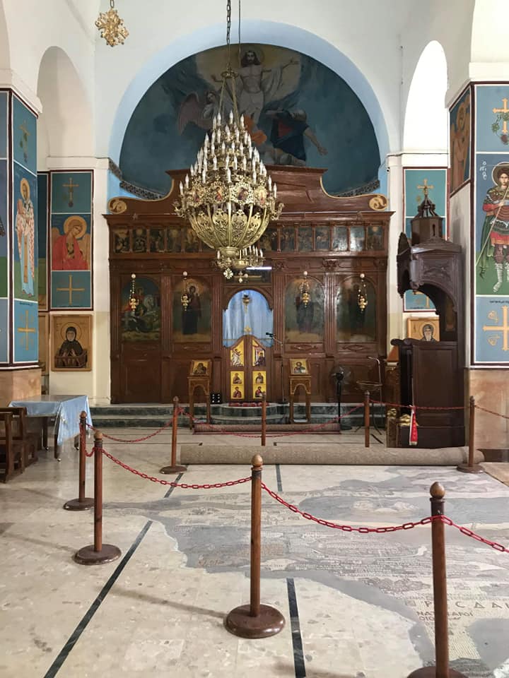 i prawosławna cerkiew św. Jerzego z przepięknymi bizantyjskimi mozaikami (datowanymi na VI wiek a szacowany rozmiar oryginału to 25 m szerokości) obrazującymi jedną, jedyną niewspółczesną religijną mapę Palestyny i Dolnego Egiptu – pachniała od początku arabską kawą, przygotowywaną (co wiemy z opowieści naszego przewodnika) wg pradawnych przepisów.
