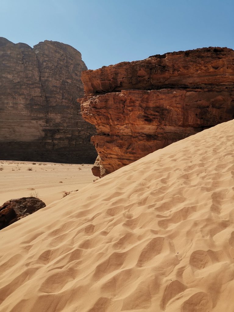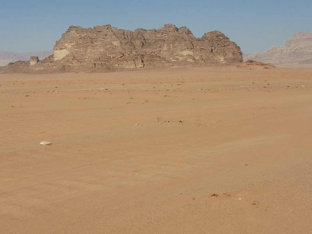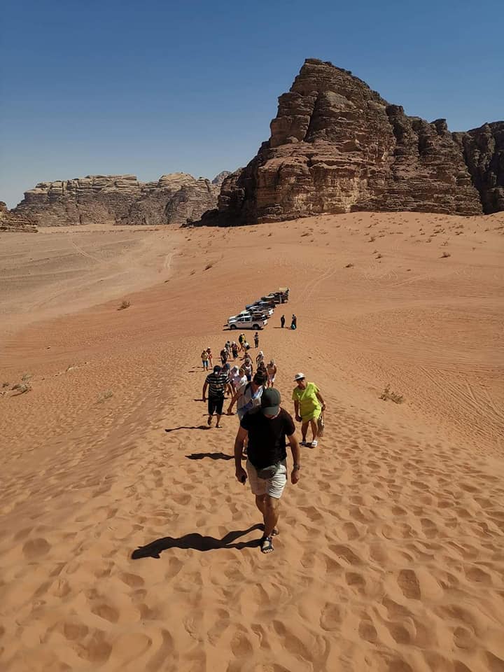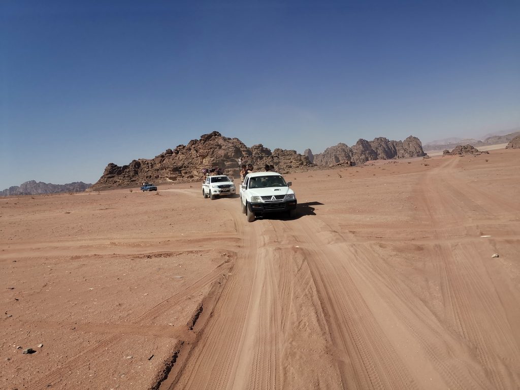 Największa w całej Jordanii, leżąca wśród granitowych i zbudowanych z piaskowca skał. Nie ma (bynajmniej na naszym pielgrzymkowym szlaku nie spotkaliśmy) drugiego takiego miejsca na świecie gdzie mimo palącego z góry słońca można by TAK odpocząć. Odpocząć od własnych myśli, problemów, hałasów świata. Zapomnieć się na chwilę i wciąż powtarzać w myślach: „uszczypnij mnie, że nie śnię”, że jestem TU i właściwie to TU jest tak absolutnie nieziemskie, iż momentami nierealne. Nie bez powodów Hollywood przyjeżdża w to miejsce regularnie by kręcić najnowsze produkcje, których akcja np.: rozgrywa się w odległym kosmosie, na Marsie. Koralowy piasek parzy stopy, jedynie po to by uwiarygodnić, że naprawdę tu jesteśmy. Przejażdżka jeepami pozwoliła nam zobaczyć pustynię w głębi, poznać jej bezkres i niedające się opisać słowami piękno. W okresie prehistorycznym zamieszkiwana była przez wiele kultur, w tym głównie nabatejskich, które pozostawiły po sobie liczne ślady, petroglify czy malunki naskalne, które mogliśmy zaobserwować. Obecnie żyją na niej Beduini, koczownicze plemiona, mieszkające w namiotach z koziej skóry. Żyją po swojemu, wg własnych praw, tradycji i kultur, które kultywują i zachowują od pradawnych pokoleń a u których mieliśmy przyjemność się zatrzymać.