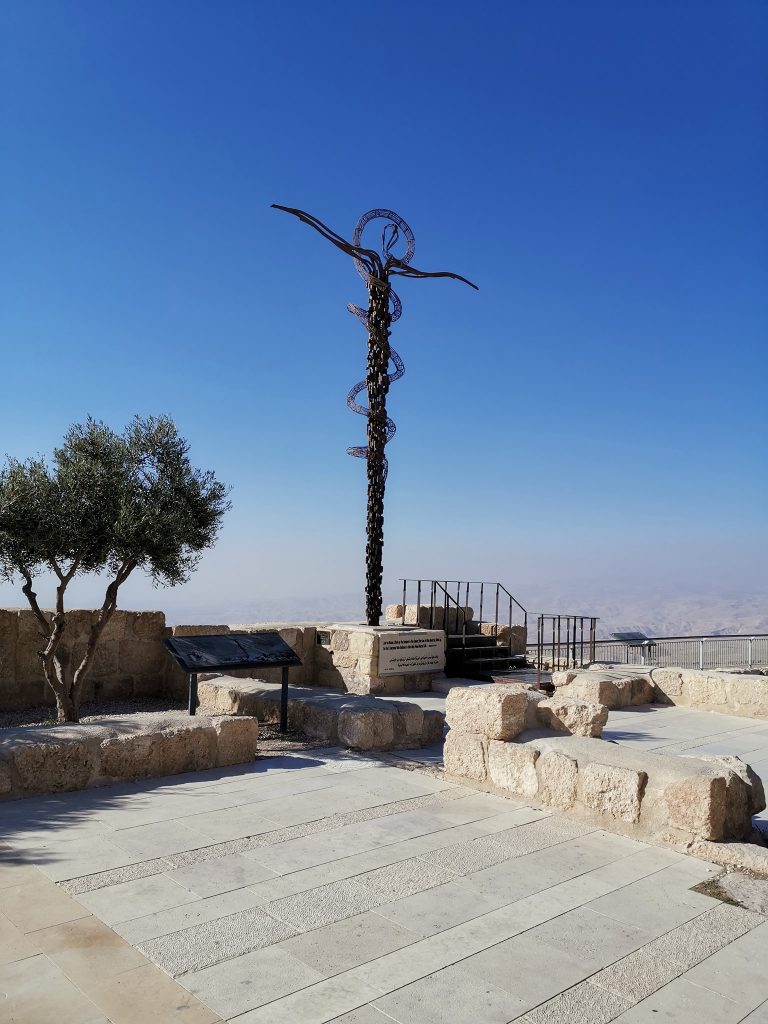 Z tego miejsca biblijny Mojżesz zobaczył Ziemię Obiecaną, do której nie było mu jednak dane wkroczyć razem z plemionami izraelskimi i tutaj także umarł. Na szczycie znajduje się Sanktuarium Mojżesza z parkiem archeologicznym a samo miejsce jest czczone przez wyznawców religii abrahamowych tj żydowskiej, chrześcijaństwa oraz islamu. Widok z tej góry – pozostaje ten sam jaki miał Prorok tysiące lat temu: oprócz bezkresu pustyni prawie nieruchome tafle wody, co jakiś czas zasnuwane ławicą mgły oraz niesamowity bezruch powietrza nadający górze aurę samotności i chęci wyrwania się z niej w bliżej nieokreśloną, tajemniczą (choć jak w przypadku Mojżesza – objawioną mu) przyszłość. To szczególne wrażenie potęguje brak większego ruchu turystycznego czy samochodowego do których w Ziemi Świętej już zdążyliśmy się przyzwyczaić. Przejmujący bezkres przesądza o specyficznym uroku i wyjątkowej atmosferze tej góry.