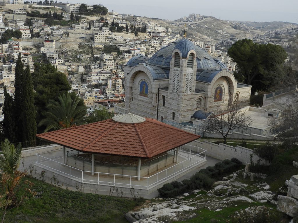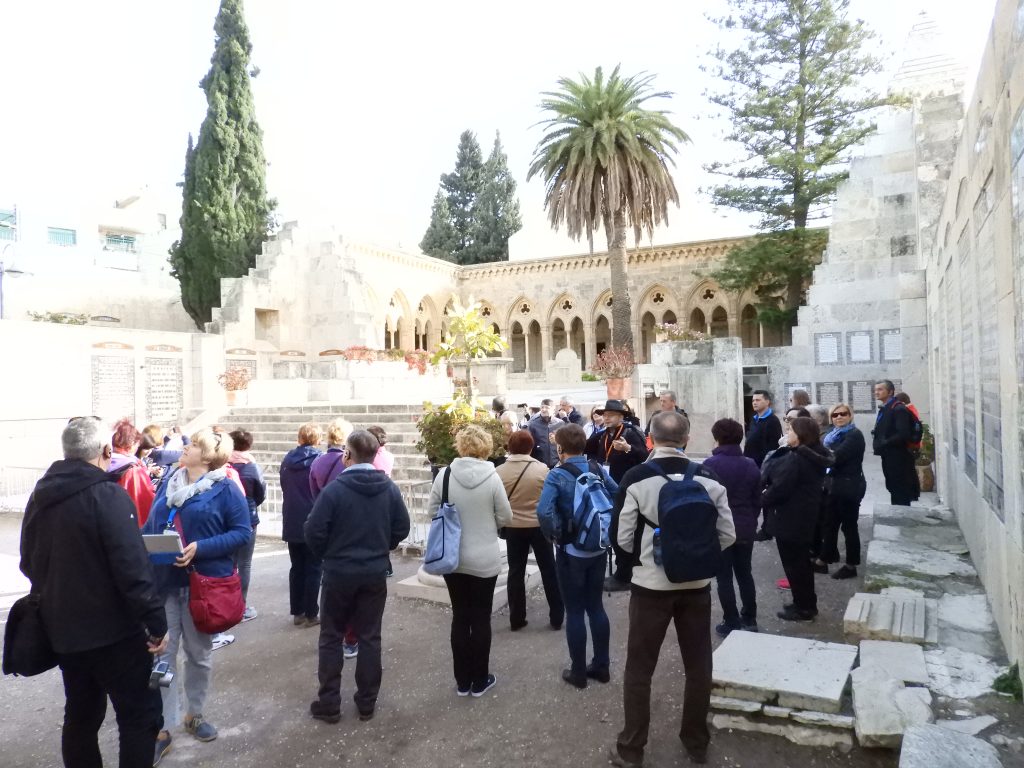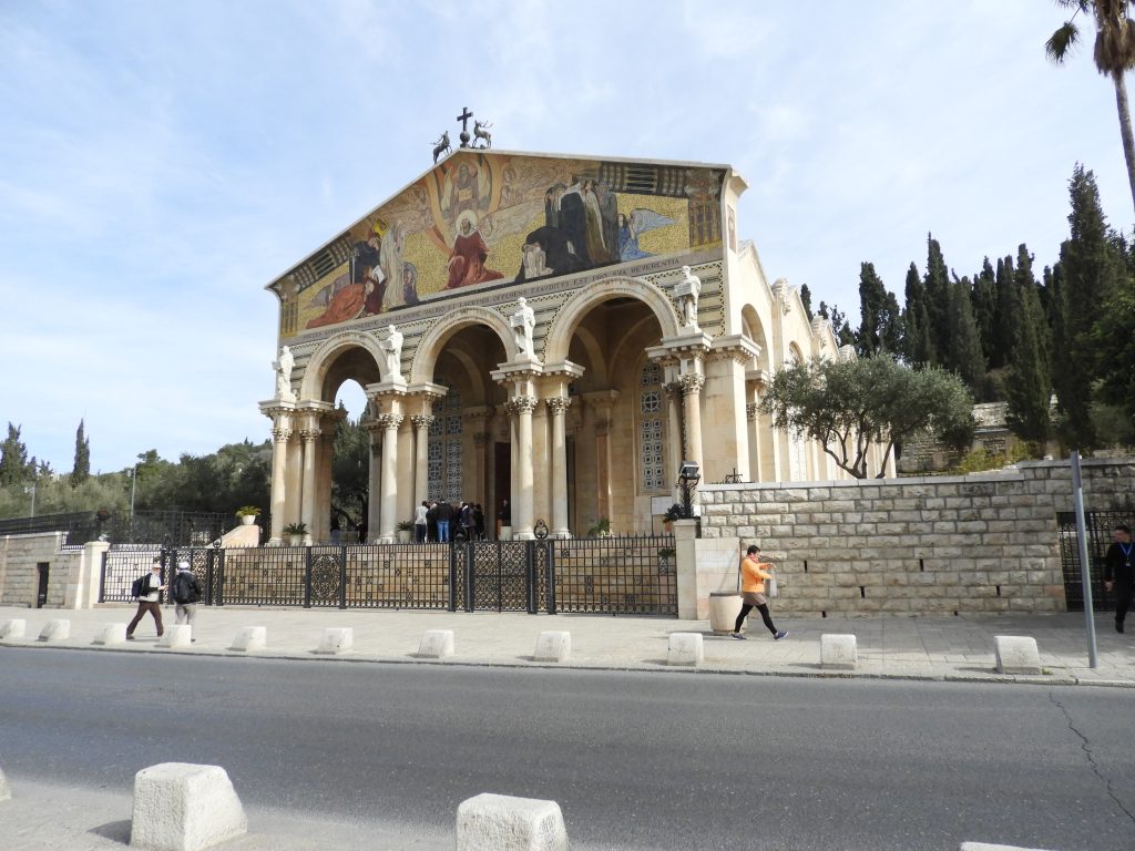 Z Góry Oliwnej Drogą Niedzieli Palmowej udaliśmy się w stronę Doliny Cedronu, odwiedzając po drodze inne ważne miejsca i świątynie związane z osobą Jezusa i Maryi. Mieliśmy ogromne szczęście, gdyż po drodze mogliśmy zajrzeć do prawosławnej rosyjskiej cerkwii św. Marii Magdaleny, do której bramy na co dzień są zamknięte. Następnie schodząc w dół nawiedziliśmy kościół Dominus Flevit (Pan zapłakał). Jest to kościół w kształcie odwróconej łzy, którego rogi ścian zwieńczono czterema dzbanami do zbierania łez. W ten sposób nawiązano do wydarzenia, gdy to Jezus w Niedzielę Palmową schodził z Góry Oliwnej i zapłakał nad losem Jerozolimy. Schodząc dalej wstępujemy do kościoła Grobu Najświętszej Maryi Panny. Wielu twierdzi, że w dolinie Cedronu znajduje się historyczny grób matki Jezusa, Maryi, która dopiero po śmierci została zabrana do nieba. Inni twierdzą, że jednak Maryja zasnęła na Górze Syjonu, którą nawiedzimy w godzinach popołudniowych. Miejsce jest ciekawe, bo schodzi się w głąb kościoła po kamiennych schodach niczym do podziemi. Do ścian kościoła przylega Grota Pojmania Jezusa – Getsemani. Po krótkiej modlitwie przechodzimy do Bazyliki Agonii (Kościoła Wszystkich Narodów), która upamiętnia miejsce, w którym Jezus modlił się tuż przed pojmaniem. Obok Kościoła na niewielkim skrawku ziemi znajduje się gaj oliwny z wiekowymi oliwkami, które mogą pamiętać czasy Jezusa. Być może to przy jednej z nich modlił się nasz Pan. Z Doliny Cedronu przejechaliśmy na jeden z punktów widokowych, aby już z innej perspektywy podziwiać panoramę Jerozolimy.